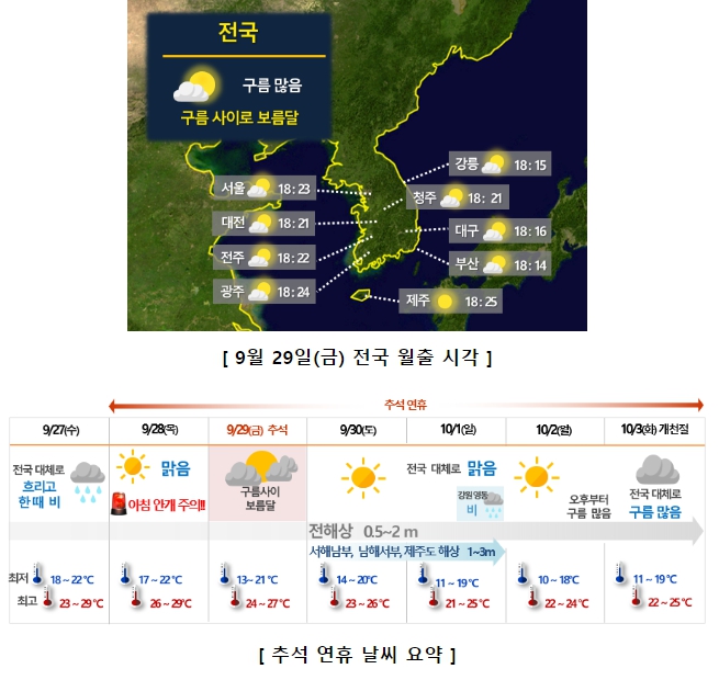 (추석/9.29.) 우리나라는 이동성 고기압의 영향으로 맑거나 가끔 구름 많은 가운데, 전국 대부분 지역에서 구름 사이로 보름달을 볼 수 있을 것으로 전망했다.