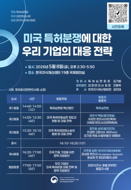 [뉴스힘=박노신 기자] 지식재산처 특허심판원은 오는 5월 8일 14시 30분 한국지식재산센터(서울 강남구)에서 우리 기업의 미국 특허분쟁 대응 역량 강화를 위해 '미국 특허분쟁에 대한 우리 기업의 대응전략' 발표회를개최한다고 밝혔다.