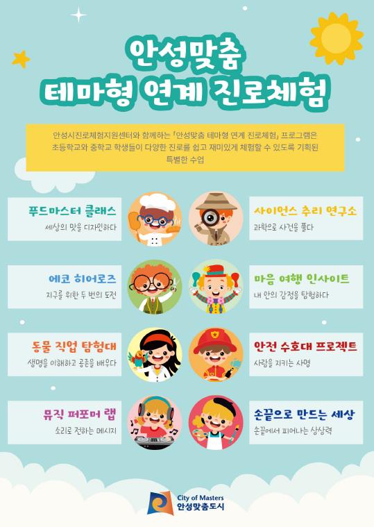 주요 테마는 ▲푸드마스터 클래스 ▲에코 히어로즈 ▲동물 직업 탐험대 ▲뮤직 퍼포머 랩 ▲사이언스 추리 연구소 ▲마음 여행 인사이트 ▲안전 수호대 프로젝트 ▲손끝으로 만드는 세상 등 8가지이며, 직업군 체험을 중심으로 구성된 테마별 콘텐츠는 학생들의 흥미를 유도하고 자기주도적 진로설계에 도움을 줄 것으로 기대된다.