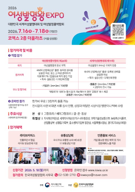 한편, 참가 신청은 산업재산권(특허·실용신안·디자인)을 출원하거나 등록한 여성이 대표 또는 임원으로 재직 중인 기업이면 가능하며, 여성발명왕EXPO 누리집에서 신청할 수 있다.