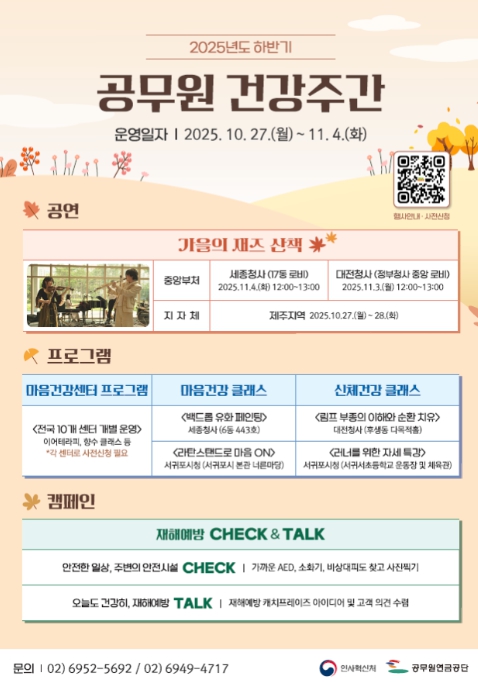 인사혁신처와 공무원연금공단은 공무원의 재해 예방과 건강한 공직문화 조성을 위해 세종, 대전, 제주지역 등에서 ‘2025 하반기 공무원 건강 주간 행사’를 오는 27일부터 11월 4일까지 동시 진행한다고 24일 밝혔다.