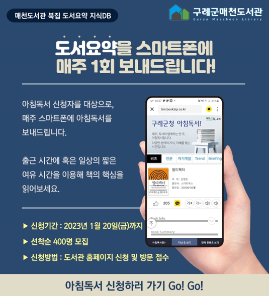[뉴스힘=주신락 기자] 전남 구례군은 군민의 독서습관 함양을 위해 스마트폰으로 다양한 지식 정보를 제공하는 아침독서 무료 서비스를 시행한다고 밝혔다.