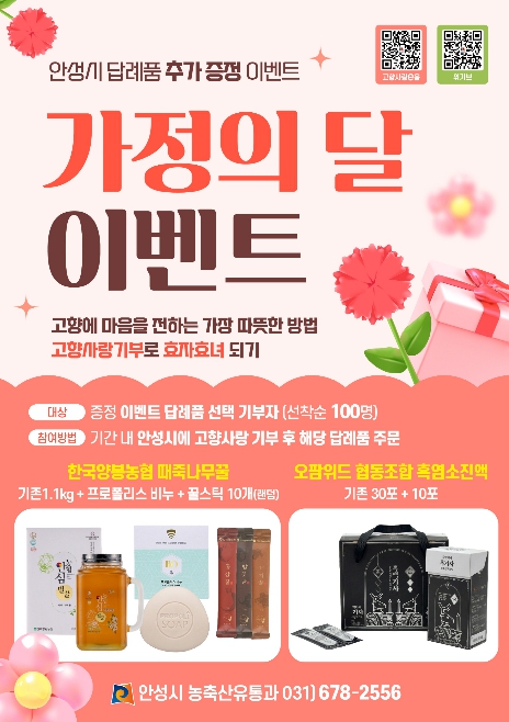 [뉴스힘=박노신 기자] 안성시는 오이데이와 5월 가정의 달을 맞아 고향사랑기부제 참여 확대와 지역 농산물 소비 촉진을 위해 ‘오이데이 이벤트’와 ‘가정의 달 이벤트’를 추진한다고 밝혔다.
