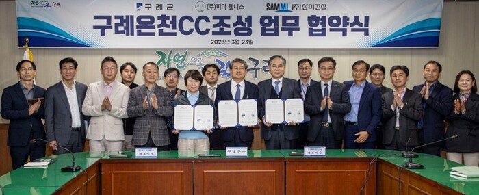 [뉴스힘=주신락 기자]  전남 구례군은 지난 23일 ㈜피아웰니스, ㈜삼미건설과 ‘구례온천CC 조성사업(가칭)’ 추진을 위한 업무협약을 체결했다고 24일 밝혔다.