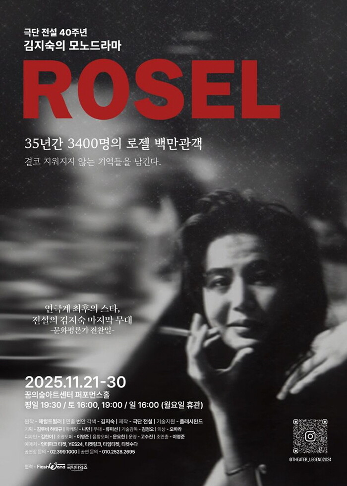 [뉴스힘=박노신 기자] 극단 전설 40주년 기념작이자 배우 김지숙의 마지막 공연인 모노드라마 〈로젤〉이 오는 11월 21일부터 30일까지 꿈의숲아트센터 퍼포먼스홀에서 막을 올린다. 35년간 3,400회 이상 공연되며 백만 명이 넘는 관객을 울린 이 작품은 여성의 주체성과 인간성의 회복을 그린 한국 연극사의 대표작으로 꼽힌다.