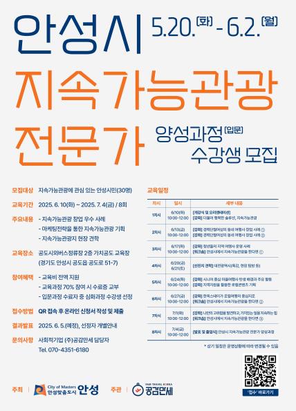 [뉴스힘=박노신 기자] 안성시는 관광을 통한 지역경제 활성화와 지속가능한 관광문화 조성을 위해 ‘2025 안성시 지속가능관광 전문가 양성과정(입문)’을 개설하고, 오는 6월 2일까지 수강생을 모집한다.