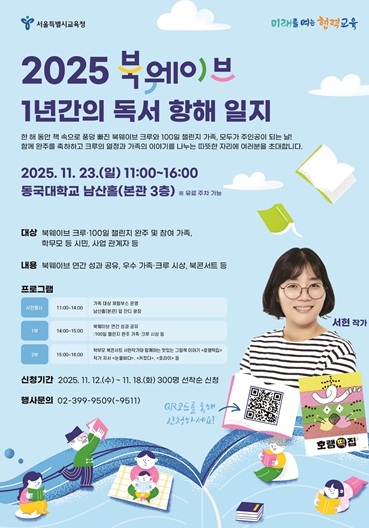 [뉴스힘=박노신 기자] 서울특별시교육청은 오는 11월 23일(일) 동국대학교 남산홀에서 가족독서 캠페인 '온 가족 북웨이브'의 1년 여정을 돌아보는'2025 북웨이브, 1년간의 독서 항해일지'를 개최한다. 이번 행사는 북웨이브 100일 챌린지 완주 가족, 북웨이브크루, 학생·시민이 함께 참여하는 서울시교육청 대표 독서문화 축제다.