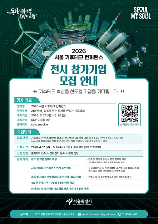 [뉴스힘=박노신 기자] 서울시는 지난 4월 17일부터 5월 6일까지 ‘2026 기후테크 컨퍼런스’ 참여할 혁신 기업을 모집한다. “AI와 함께, 회복력 있는 도시를 만드는 기후테크”를 주제로 열리는 이번 행사는 환경의 달을 맞아 6월 25일~26일 이틀간 DDP 아트홀 2관에서 개최된다.