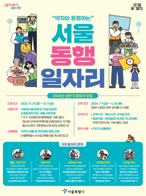 참여를 희망하는 시민은 12월 5일까지 주소지 동주민센터에서 상담 및 신청이 가능하다. 대상은 18세 이상 서울시민으로, 세대원 합산 중위소득 85% 이하이면서 합산재산 4억 9,900만 원 이하인 경우 신청할 수 있다. 최종 선발된 참여자는 1일 6시간, 주 5일 근무하며 일급은 세전 62,000원 수준으로 월 평균 약 180만 원을 받는다.