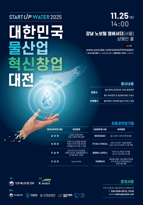 [뉴스힘=박노신 기자] 기후에너지환경부와 한국수자원공사는 물산업을 우리나라의 새로운 성장동력으로 성장시킬 ‘혁신형 고성장 기업(유니콘)’을 발굴하기 위해 11월 25일 노보텔앰버서더호텔(서울 강남구 소재)에서 ‘대한민국 물산업 혁신 창업대전 2025’ 최종 경연을 개최한다고 밝혔다.