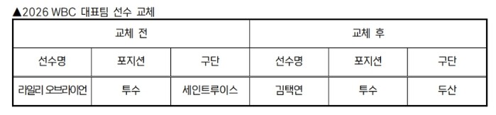 [뉴스힘=박노신 기자] KBO 전력강화위원회는 부상으로 인해 WBC 참가가 어려워진 세인트루이스 라일리 오브라이언을 대체할 선수로 두산 김택연을 확정하고 WBC 조직위에 선수 교체 승인을 요청했다.