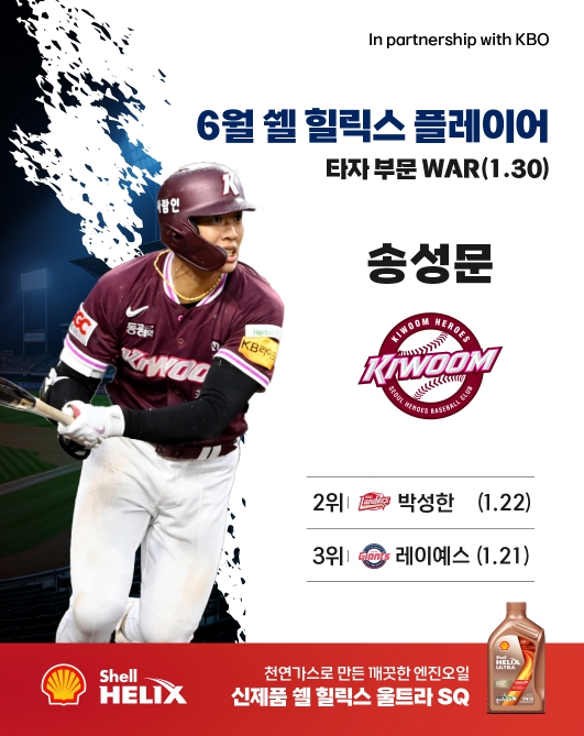 [뉴스힘=박노신 기자] KBO와 한국쉘석유주식회사가 함께 시상하는 ‘쉘힐릭스플레이어’의 2025 신한 SOL뱅크 KBO 리그 6월 수상자로 NC 로건과 키움 송성문이 선정됐다.