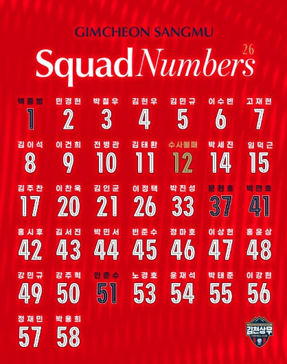 [뉴스힘=박노신 기자] 김천상무가 2026시즌 프로선수단 배번을 공개했다.