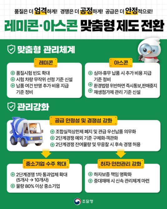[뉴스힘=박노신 기자] 조달청은 레미콘·아스콘의 물품 특성을 반영한 맞춤형 제도 운영을 위해 관련 규정을 전면 개정하고 2026년 3월 1일부터 시행한다고 밝혔다.