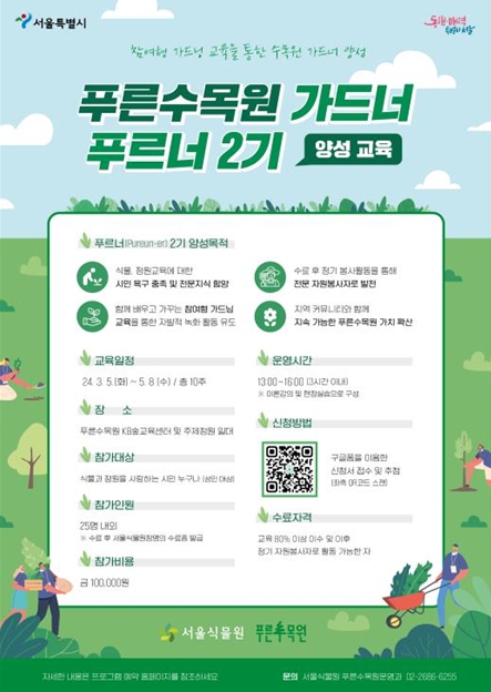 박미성 서울식물원장은 “지역사회와 함께하는 푸른수목원의 가치 향상을 위해 정원을 매개로 한 커뮤니티 활성화는 의미가 깊다”며 “푸르너 양성 교육을 통해 시민들과 함께 만들고 가꾸는 정원문화가 꾸준히 지속되길 기대한다”고 밝혔다.
