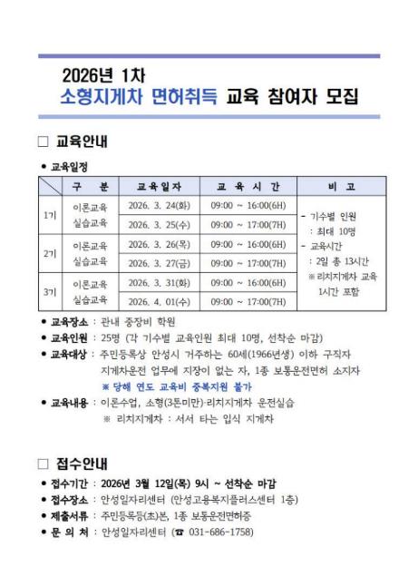 [뉴스힘=박노신 기자] 안성시는 2026년 맞춤형 취업지원 교육의 일환으로 오는 3월 12일부터 ‘1차 소형지게차 면허취득 교육’에 참여할 교육생을 모집한다.