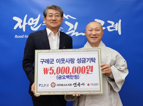 [뉴스힘=주신락 기자] 전남 구례군은 지난 5일 대한불교조계종 지리산 연곡사가 관내 어려운 이웃을 위해 성금 5백만 원을 기탁했다고 밝혔다.