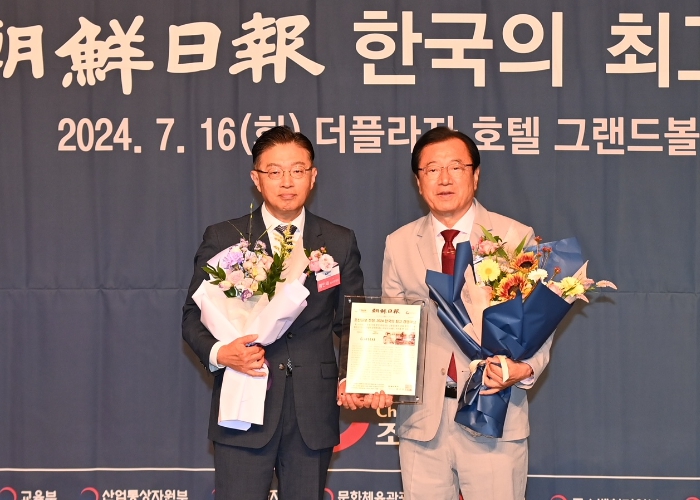 | ▲ 이현재 하남시장(사진 오른쪽)이 16일 서울 중구 더플라자 호텔 그랜드 볼룸에서 열린 「2024 한국의 최고 경영대상」에서 하남시를 대표해 ‘가치창조경영’ 부문 대상을 수상한 후 심사위원장인 황인태 중앙대 교수(사진 왼쪽)과 기념사진을 촬영하고 있다. |
