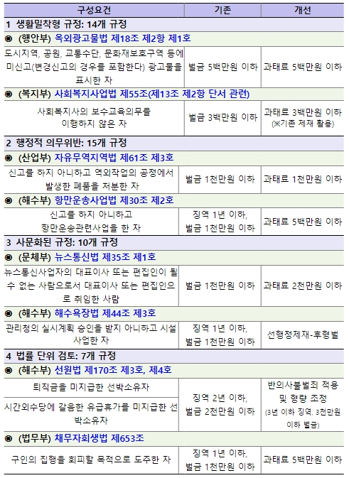 신고 등 경미한 의무위반행위에 대한 지나친 형사벌을 억제하고, 형벌이 필요한 경우라도 보충성·비례성 등 법원칙을 고려한다는 원칙아래 유사법률 간 법정합성·일관성 제고, 의무위반의 정도와 제재수준 간 비례성 확보, 전과자 양산 등 부작용을 완화하는 방향으로 개선했다. 개선시 입법목적 달성이 곤란해지거나, 안전 등 중대한 법익 침해 우려가 있는 규정은 현행 유지한다.