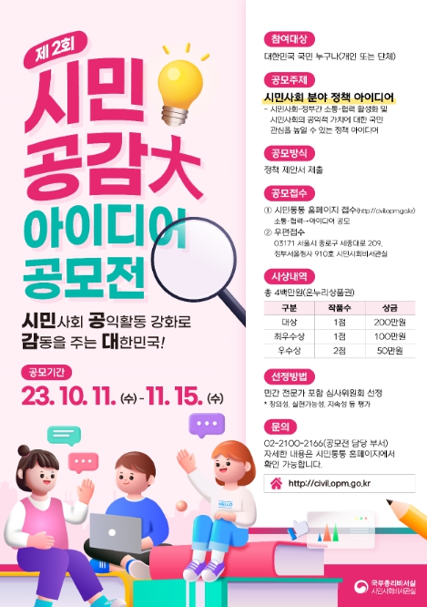 국무총리비서실 시민사회비서관실은 시민사회의 공익적 가치에 대한 국민적 관심을 제고하고 정부-시민사회간 소통·협력을 활성화 하고자 ‘제2회 시민 공감大 아이디어 공모전’을 개최한다.