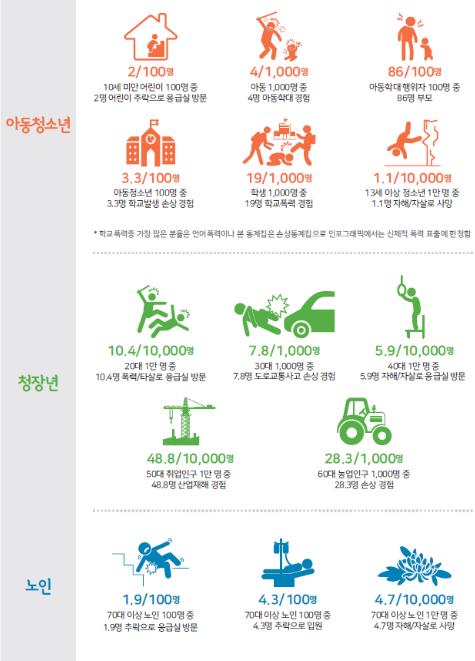생애주기별로 달라지는 활동과 환경에 따라 발생하는 손상의 양상도 다르게 나타났다. 아동·청소년기에는 아동 1,000명 중 4명이 아동학대를 경험했으며, 아동학대 행위자는 100명 중 86명이 부모였다(2023년 아동학대 주요통계). 학생 100명 중 3.3명이 학교에서 일어나는 손상을 경험했으며(2023년 학교안전사고조사), 학생 1,000명 중 19명이 학교폭력을 경험했고(2023년 학교폭력 실태조사), 13세 이상 청소년 1만 명 중 1.1명이 자해·자살로 사망했다(2023년 사망원인통계).