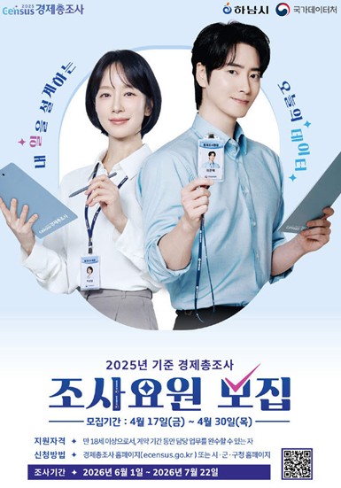 [뉴스힘=박노신 기자] 하남시는 지난 4월 17일부터 30일까지 ‘2025년 기준 하남시 경제총조사’ 수행을 위한 조사요원을 모집한다고 밝혔다.