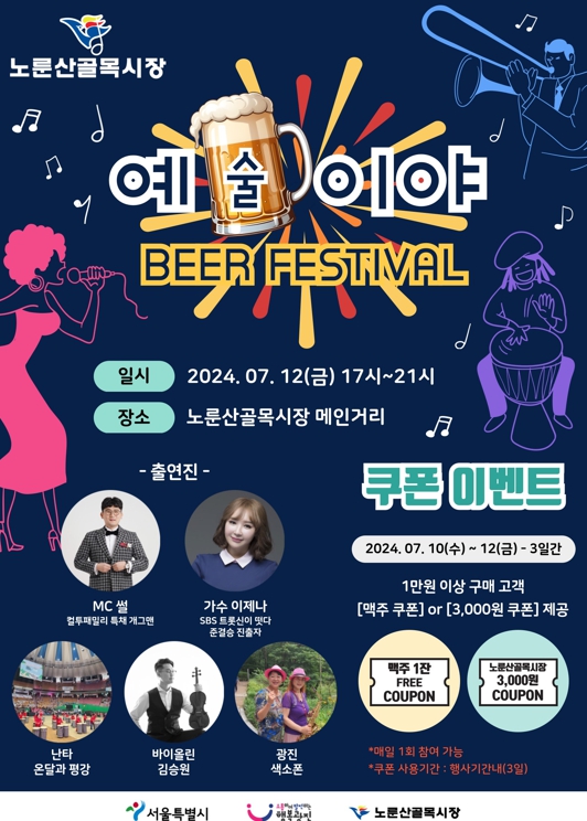 비어페스티벌은 12일 오후 5시부터 9시까지, 노룬산골목시장 입구에서 열린다. 상인회 주관으로 ▲ 난타, 바이올린 공연 ▲ 구민 노래자랑 및 댄스 경연 ▲ 무료 맥주 쿠폰, 경품 증정 이벤트 등 시장 방문객을 위한 다채로운 먹거리, 볼거리, 즐길거리를 선보일 계획이다.