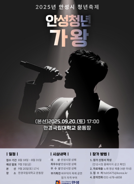 모집 대상은 안성시에 거주하거나 활동 중인 19~39세 청년으로, 개인 또는 팀 단위로 지원할 수 있다. 접수 기간은 8월 18일부터 8월 31일까지이며, 신청서와 예선 심사용 노래 영상을 이메일로 제출하면 된다.