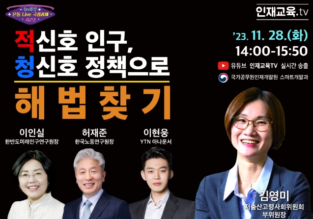 국가공무원인재개발원(원장 김채환)은 오는 28일 ‘적신호 인구, 청신호 정책으로 해법 찾기’라는 주제로 ‘온통 실시간(Live) 국정과제’ 유튜브 공개강좌를 진행한다고 27일 밝혔다.
