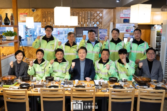 | ▲ 2월 9일 윤석열 대통령은 설 연휴 첫날인 오늘 서울 동작구 한 식당에서 연휴에도 거리 청소와 폐기물 수거 등 사회에 꼭 필요한 일을 묵묵히 수행하고 있는 환경공무관들과 떡국으로 조찬을 함께 했다. |