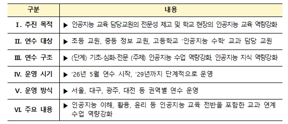 교육부와 한국교육학술정보원(원장 정제영)이 협력하여 개발한 이 연수 과정은 교육 내용으로 인공지능 기술의 이해·활용·윤리에 대한 사항을 포괄하고 있으며, 교과 수업과 연계된 교수·학습 역량을 강화하는 데 중점을 둔 것이 특징이다. 특히, 인공지능의 개념과 원리, 최신 인공지능 기술의 교육적 활용, 인공지능 윤리와 사회적 영향 등을 균형 있게 반영하여 인공지능 전반을 아우르는 연수 체계를 구축했다.