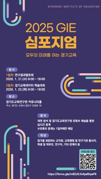 (재)경기도교육연구원은 ‘모두의 미래를 여는 경기교육’을 주제로 2025 GIE 심포지엄을 개최한다. 심포지엄은 1월 21일(09:00~18:00), 1월 22일(10:00~18:00)에 경기도교육연구원 커뮤니티홀과 대회의실에서 개최되며, 1일차 행사는 유튜브를 통해 실시간 생중계도 진행한다. 교직원, 교육행정 및 연구기관 종사자, 학생 및 학부모, 연구자, 기타 교육 관계자 등이 참석대상이며, 임태희 경기도교육감도 함께한다.