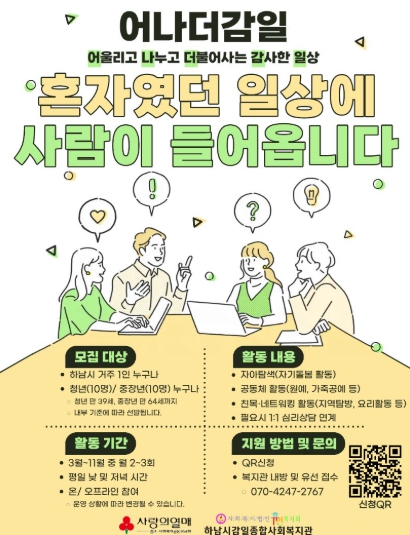 [뉴스힘=박노신 기자] 하남시감일종합사회복지관(사회복지법인 휴먼복지회 운영)은 2026년 1월부터 12월까지 1인 가구의 사회적 관계망 형성과 지역사회 참여 확대를 위한 특화사업 '어나더 감일(어울리고 나누고 더불어사는 감사한 일상)'을 운영하며 이에 참여할 대상자를 모집한다.