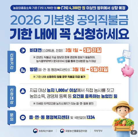 [뉴스힘=박노신 기자] 2026 기본형 공익직불금 기한 내에 꼭 신청하세요.