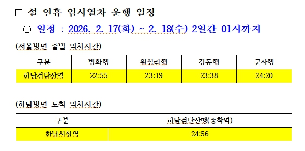이번 연장 운행은 명절 기간 심야 시간대 대중교통 이용 수요가 급증할 것에 대비한 조치로, 하남시가 서울교통공사와 협의하여 시민들의 발이 되어줄 철도 서비스를 확대한 결과다.