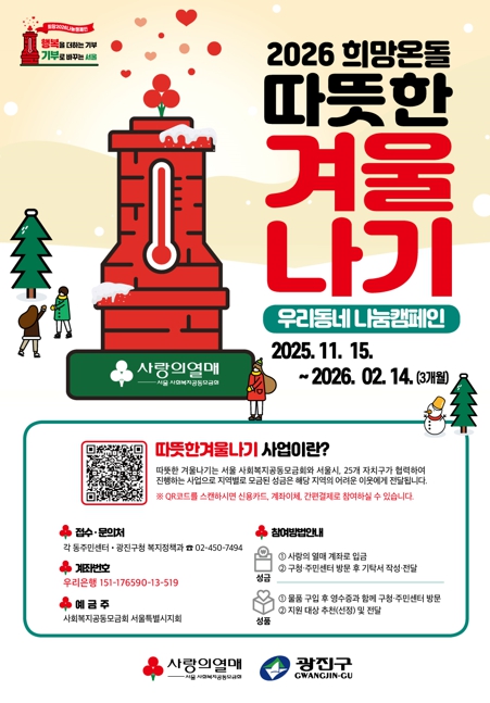 [뉴스힘=박노신 기자] 광진구는 내년 2월 14일까지 3개월간 ‘2026 희망온돌 따뜻한 겨울나기 사업’을 추진한다.