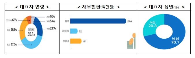 대표자 연령은 평균 55.1세, 성별은 남성 70.7%, 여성 29.3%로 조사됐으며, 기업당 평균 매출액은 266.4백만원, 당기순이익은 36.2백만원으로 나타났다.