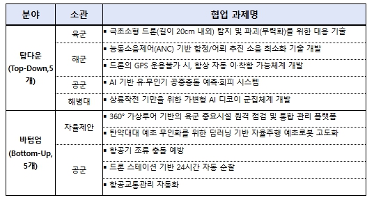 이번 방산 챌린지는 군에 필요한 기술과 창업기업이 보유한 기술을 중심으로 ①군 제안 과제인 탑다운(Top-down) 방식과 ②창업기업 제안 기술인 바텀업(Bottom-up) 방식을 병행하여 추진, 최종 10개 과제를 선정했다.