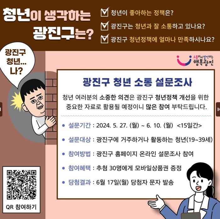 설문조사 대상은 광진구에 거주하거나 생활권이 있는 19세에서 39세 사이의 청년들로, 참여를 희망하는 청년은 광진구청 누리집을 통해 설문에 응할 수 있다. 설문에 참여한 청년 중 30명에게는 추첨을 통해, 모바일 상품권(1만 원권)을 증정할 예정이다.