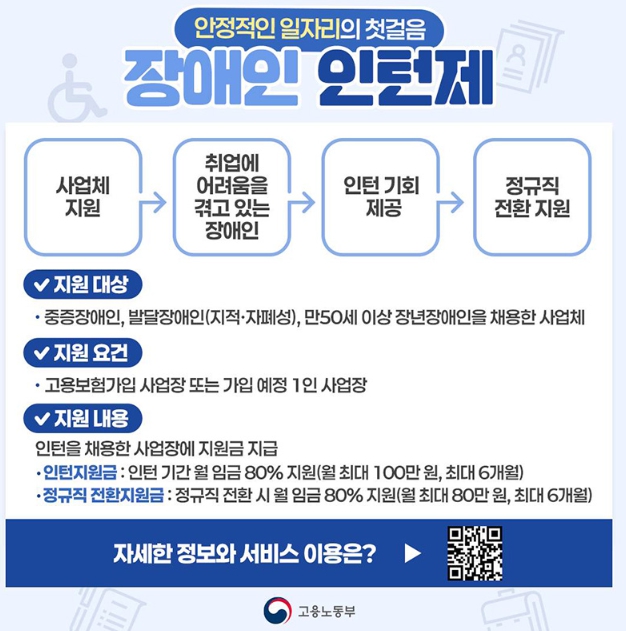 · 인턴지원금 : 인턴 기간 임금 80% 지원(월 최대 100만 원, 최대 6개월)