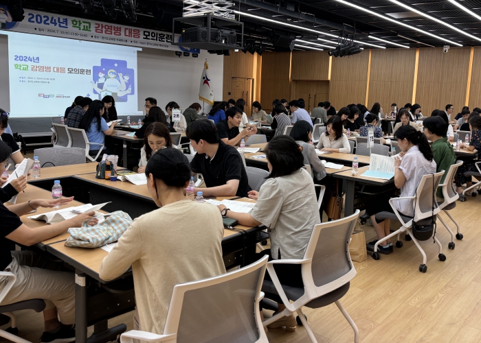 또 미리 제공한 훈련용 워크북을 참고해 제시한 감염병 발생 시나리오 단계에 따라 학교, 교육(지원)청, 보건소 구성원별로 주요 조치사항을 작성하고 토의하는 방식으로 모의훈련을 실시했다.