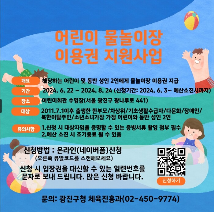 김경호 광진구청장은 “어린이에게 가족과 함께 할 수 있는 여가생활 기회를 제공하고자, 물놀이장 이용권 지원 사업을 마련했다”라며, “앞으로도 소외받는 계층 없이, 구민 모두가 행복하고 건강한 광진구를 만드는 데 최선을 다하겠다”라고 말했다.