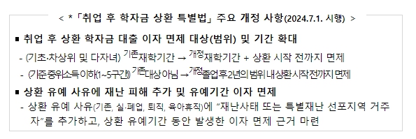 이번 시행령 개정은 청년들의 학자금 대출 이자 부담 경감을 위한 이자 면제 대상 및 기간 확대 등을 주요 내용으로 하는 '취업 후 학자금 상환 특별법(2023.12.26.개정)'이 오는 7월 1일에 시행됨에 따라 추진됐다.