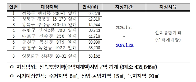 신규 지정 대상은 성동구 1곳, 성북구 1곳, 강북구 1곳, 은평구 1곳, 마포구 1곳, 금천구 2곳, 영등포구 1곳으로 총 8개 구역이다. 성동구 행당동 300-1 일대 외 7곳(총435,846㎡)이며, 효율적인 구역 관리를 위해 기존 신속통합기획 주택재개발 선정 구역과 동일한 만료 기간으로 설정했다.