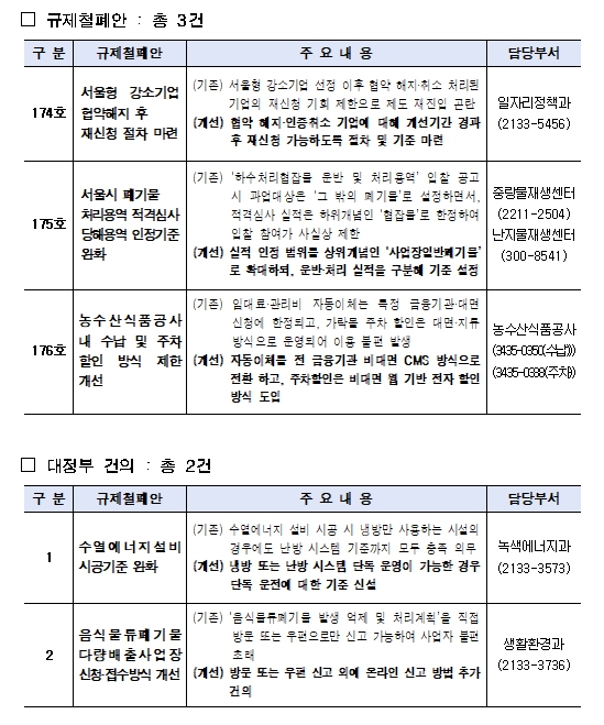 시는 자체적으로 개선 가능한 ▴서울형 강소기업 협약해지 후 재신청 절차 마련(174호) ▴서울시 폐기물 처리용역 적격심사 당해용역 인정기준 완화(175호) ▴농수산식품공사 내 수납 및 주차할인 방식 제한 개선(176호) 과제는 정비하고, ▴수열에너지 설비 시공기준 완화, ▴음식물류폐기물 다량배출사업장 신청.접수방식 개선 등 2건은 정부에 공식 건의했다.