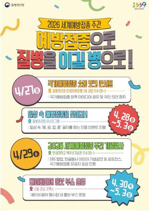 이번 '2026 예방접종주간행사'는 4월 27일(월)을 시작으로 ▲국민과 함께하는 토크 콘서트, ▲EBS 협업 어린이 공연 '한글용사 아이야', ▲온라인 참여이벤트, ▲코엑스 베이비페어(홍보부스 운영)까지 총 4개의 행사를 통해 예방접종주간의 의미를 효과적으로 확산시킬 예정이다.