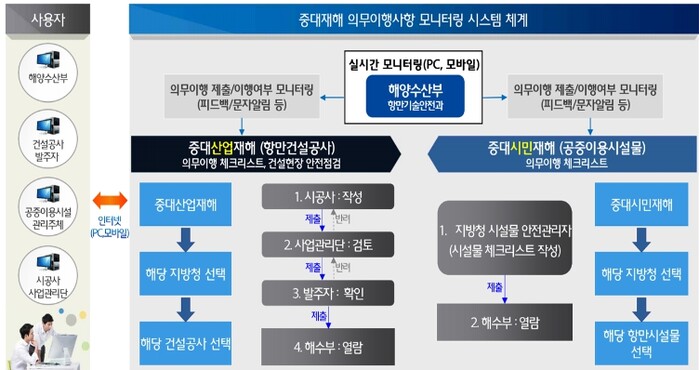 이에, 해양수산부는 올해 1월부터 기존에 운영 중인 ’항만시설물유지관리시스템(POMS)*‘ 내에 ‘중대재해 의무이행사항 모니터링 시스템’을 구축하여, 시범운영(9. 20. ~10. 13.)과 사용자 교육(11. 30.)을 거쳐 12월 1일부터 운영을 시작하게 됐다.