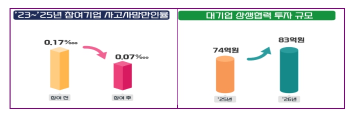 대기업과 정부의 지원을 받은 사업장은 안전한 일터로 거듭나고 있다. 지난 3년간 사업에 참여한 기업 10,453곳의 평균 사고사망만인율은 0.07‱로 참여 이전(0.17‱)보다 절반 이하로 감소했다.