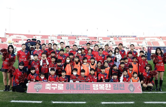 | ▲ 11월 1일 포항전 홈경기에서 김천상무 선수단과 에스코트 참가자가 사진을 찍고 있다. |