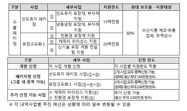 수산식품 수출업체당 최대 2,000만 원까지 ▲ 선도유지 포장재.부자재 ▲ 냉동·냉장 포장재.부자재 ▲ 친환경 포장재.부자재 ▲ 캐릭터 사용권 ▲포장재 개발 컨설팅 등 수출에 필요한 다양한 분야를 지원한다.